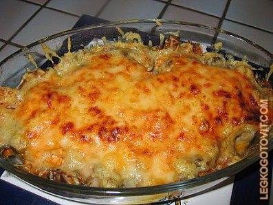 Взбить яйца с молоком, добавить молоко и половину натертого сыра. Запеканку залить соусом, посыпать оставшимся соусом. Запекать 15-20 минут при 200° C.