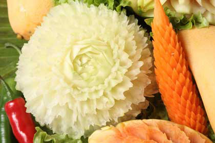 Китайской технике карвинга, использующей трафареты, выемки и формочки, обучиться легче, но в ней нет той утонченности и изысканности, которой можно достичь с помощью тайской ручной работы ножом и резцами.